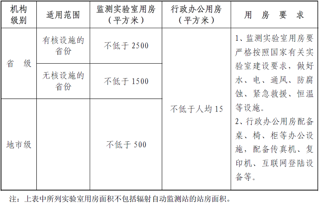 业务用房是开展辐射环境监测与监察工作必备的基础之一,特别是监测实验用房、辐射自动监测系统用房是开展辐射环境监测和监察工作的基础条件,应予以重点保证。辐射环境监测与监察机构业务用房面积及要求见表3。