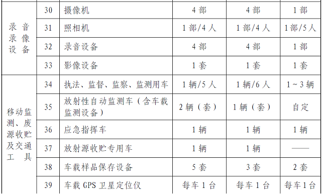 基本仪器设备是保障辐射环境监测与监察机构开展辐射环境质量监测(包括土壤、空气、水体、生物样品、陆地、口岸、海洋、电磁等项目的环境质量监测)、核设施和辐射源监督性监测(包括各类核设施、铀矿冶、放射性废物处理处置设施、电磁辐射设施、放射性同位素与射线装置、伴生放射性矿等)、日常核与辐射安全监督检查和执法的基础条件。辐射环境监测与监察机构必须配置的仪器设备的最低配备标准见表4。